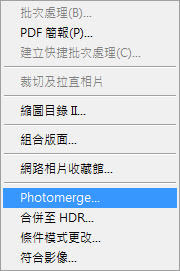 開啟 Photoshop 後,使用指令列的檔案 > 自動 > Photomerge。
