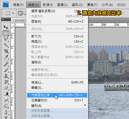 2. 選取 編輯 > 內容感知比率,也可以使用快捷鍵(Alt + Shift + Ctrl + C)呼叫。