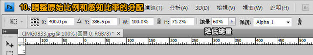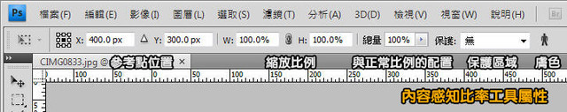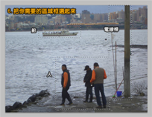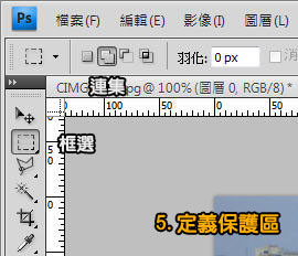 5. 內容感知比率除了用中心參考點控制外,也可以利用色版控制你想保留不變的區域。我們先把剛剛的改變的恢復回來,再選擇框選工具,使用聯集。