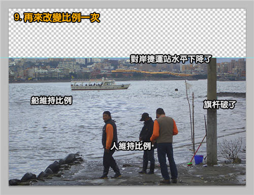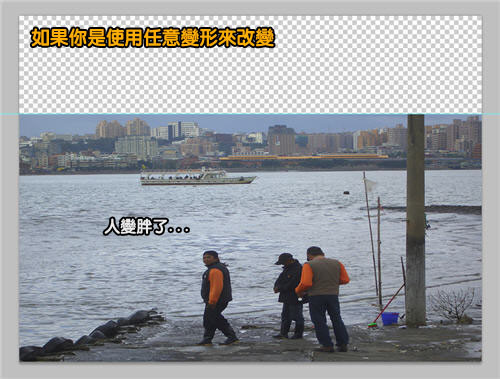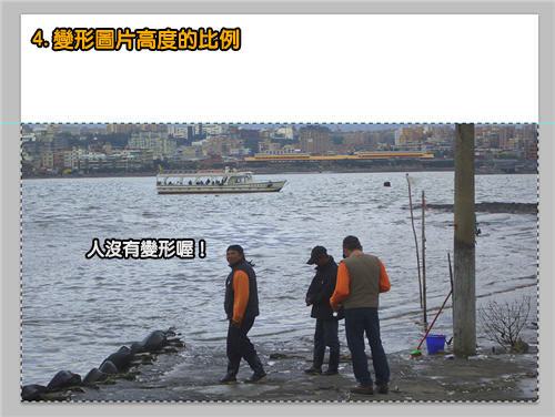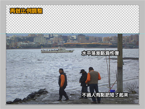4. 我們拖曳上方的控制點,讓圖片變矮一點,接著你會發現人物並沒有因縮放而失真。